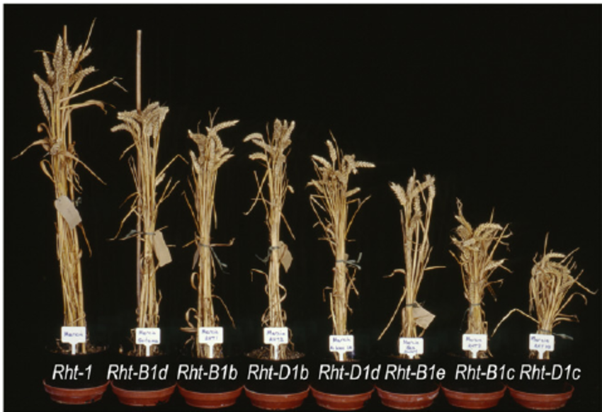 Los genes de enanismo más importantes del trigo son clasificados como insensibles a las giberelinas. Los alelos de enanismo insensibles a giberelinas Rht-B1b o Rht-D1b están presentes en la gran mayoría de las variedades de trigo semienanos. Ambos se originan a partir de la antigua variedad japonesa Norin 10 (Flintham et al., 1997).