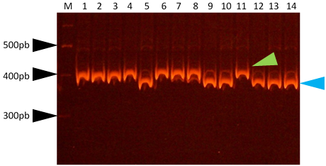 En base a la mutación descripta por Bonnin et al. (2007), Chen et al. (2010) desarrollaron un marcador de PCR tipo CAPS para detectar el alelo precoz y tardío para el gen FT-D1 (Vrn-D3). Para poder diferenciar los alelos luego de la amplificación por PCR, los productos son digeridos con la enzima de restricción NcoI. El alelo salvaje precoz, sin la deleción, presenta un producto de digestión de 401 pb (punta de flecha verde, calles 1-4, 6-8, 12). Por otro lado, el alelo tardío con la deleción puntual muestra productos de digestión 375 + 27 pb (punta de flecha celeste, calles 5, 9, 10, 12-14).