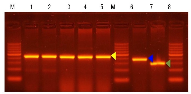 Los productos de PCR son visualizados en geles de agarosa al 2% teñidos con bromuro de etidio. La punta de flecha verde indica el fragmento de ADN de 290 pb perteneciente al alelo insensible Ppd-A1a (GS-105) (calle 7). La punta de flecha azul indica el fragmento de ADN de 380 pb perteneciente al alelo insensible Ppd-A1a (GS-100) (calle 6). La punta de flecha amarilla (calles 1 a 5) indica el fragmento de 452 pb perteneciente al alelo sensible Ppd-A1.
