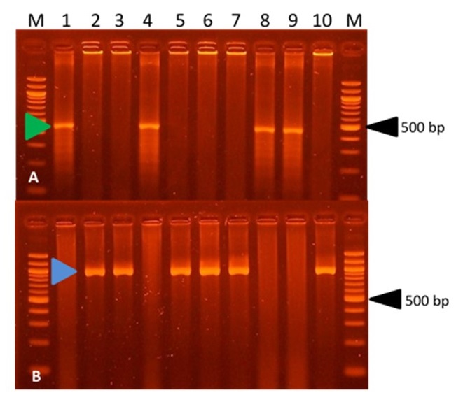 Figura A: La punta de flecha verde marca el fragmento de ADN de 473 pb perteneciente al alelo primaveral Vrn-D1 (calles 1, 4, 8 y 9). La ausencia de amplificación señala la presencia del alelo invernal. Figura B: La punta de flecha azul marca el fragmento de 997 pb perteneciente al alelo invernal Vrn-B1 (calles 2, 3, 5, 6, 7 y 10).